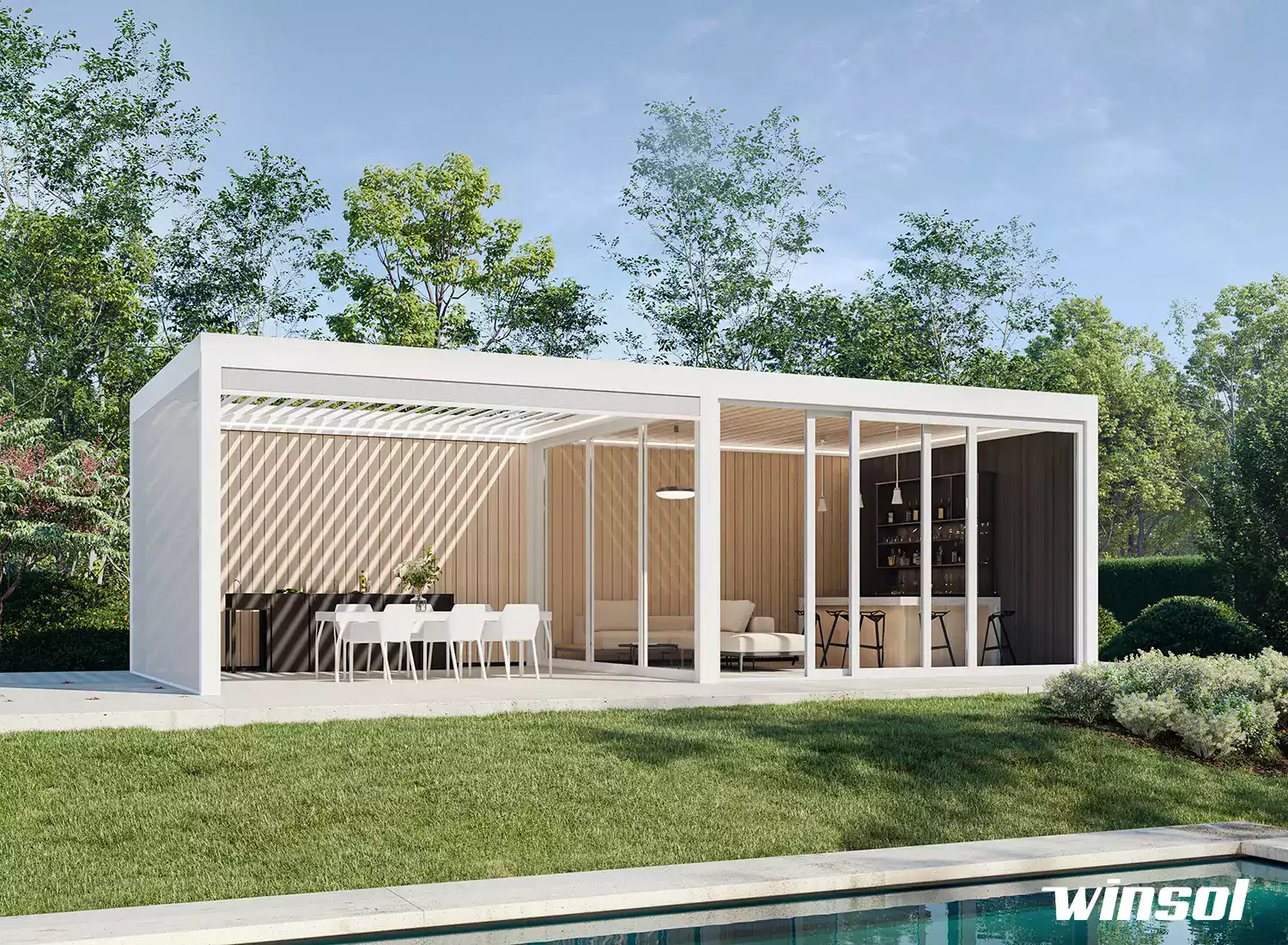 Les pergolas à toit plein combiné, comme les modèles de la marque Winsol, associent intelligemment zones fixes et parties ouvertes. Ce type de pergola permet de bénéficier à la fois d’une protection permanente contre la pluie ou le soleil, et d’une luminosité naturelle maîtrisée.